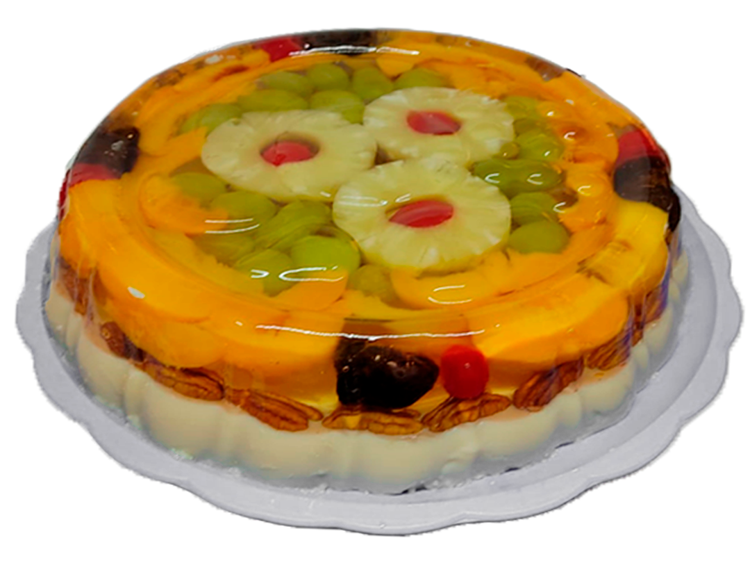 La Gelatina de Frutas, ideal para 12 personas, combina piña, durazno, uvas, cerezas, ciruela pasa y nueces. La parte superior presenta frutas en gelatina de agua sabor almíbar, mientras que la parte inferior es gelatina de leche. Consulta disponibilidad para disfrutar de esta fresca y deliciosa opción.